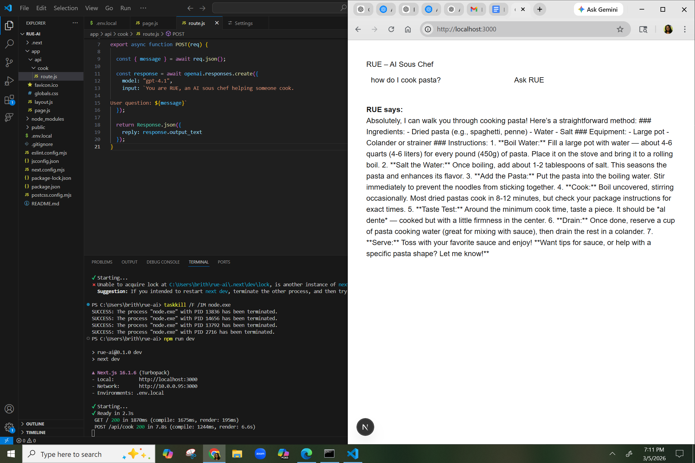 The first version of RUE started as a simple web interface connected to OpenAI. The goal was to test whether AI could maintain the structure of a recipe while responding naturally to interruptions and questions.